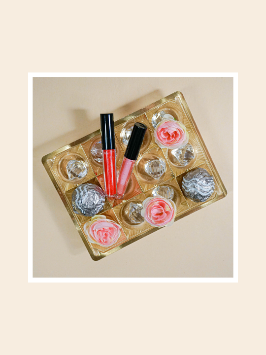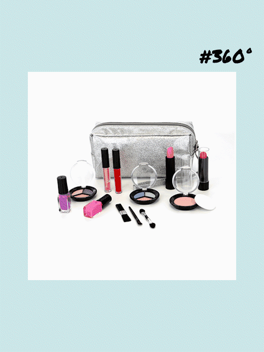 Our set contains 1x Pink glitter cosmetic bag, 1x Blush powder, 2x Lipsticks, 2x Nail polishes, 2x Glitter lip gloss, 3x Professional brushes, 6x Eyeshadow powders.